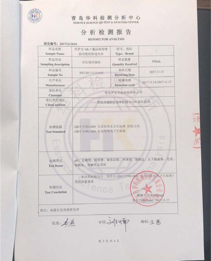 青島羅寶節(jié)能科技有限公司是專業(yè)從事高新技術(shù)產(chǎn)品研發(fā)與生產(chǎn)的科技創(chuàng)新型企業(yè)。公司與山東高校、韓國(guó)ENG公司、青島泰能科技、浙江嘉誠(chéng)環(huán)保科技有限公司等多家公司聯(lián)合研發(fā)出在涂料行業(yè):具有國(guó)內(nèi)外先進(jìn)技術(shù)【IPN·互穿網(wǎng)絡(luò)聚合物】的高新技術(shù)產(chǎn)品,羅寶NR-7高滲透性氟硅防腐涂料(已經(jīng)獲得國(guó)家發(fā)明專利和實(shí)用新型專利,發(fā)明專利號(hào):ZL 2022 1 0087088.X,實(shí)用新型專利號(hào):ZL 2017 2 0554025.5)且通過國(guó)家多項(xiàng)檢測(cè),同時(shí)也通過韓國(guó)20余項(xiàng)檢測(cè)、并且達(dá)到韓國(guó)國(guó)家飲用水衛(wèi)生標(biāo)準(zhǔn),可耐溫300℃,耐目前已知的各種腐蝕性酸、堿、鹽等介質(zhì)。與泰能科技公司聯(lián)合研發(fā),管道防腐系列產(chǎn)品獲國(guó)家發(fā)明專利證書(發(fā)明專利號(hào):ZL 2022 1 0087088.X,實(shí)用新型專利號(hào):ZL 2017 2 0554025.5),與現(xiàn)有管道防腐涂料性能比較,使用壽命更加長(zhǎng)久,低表面處理、生產(chǎn)工藝簡(jiǎn)單,接口防腐技術(shù)也申請(qǐng)了國(guó)家發(fā)明專利,可達(dá)與管道防腐同壽命,可以在+50℃~零下-30℃環(huán)境下施工。