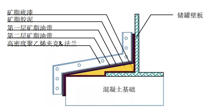 礦脂底漆層主要是采用底漆均勻涂敷在儲罐壁板、儲罐邊緣板、水泥基座上表面、水泥基座側(cè)面上,用來改善混凝土基臺和儲罐鋼板的表面質(zhì)量。中間填充層是在罐壁凹角處自里向外用礦脂膠泥填充過渡,在混凝土基臺上形成斜坡,引導雨水流出。油帶層是用兩層礦脂油帶緊密貼覆在礦脂油和礦脂膠泥施工區(qū)域,形成致密的油性防腐層。夾克外護緊密覆蓋在礦脂帶上面,為防腐層提供可靠的機械保護。