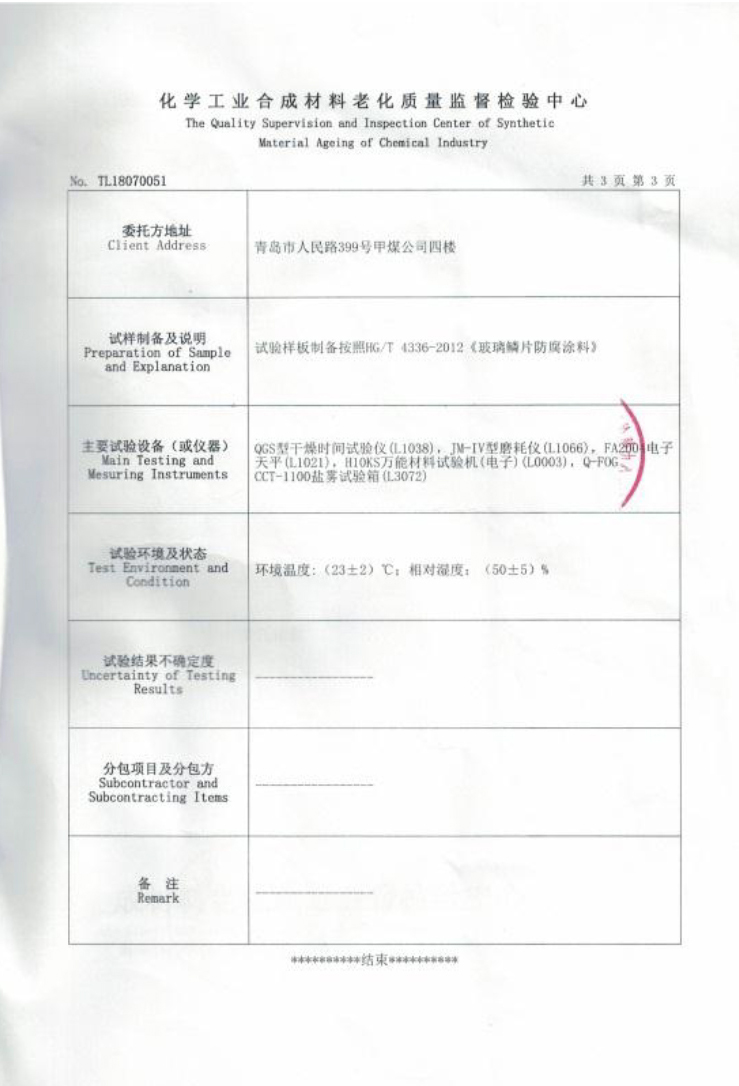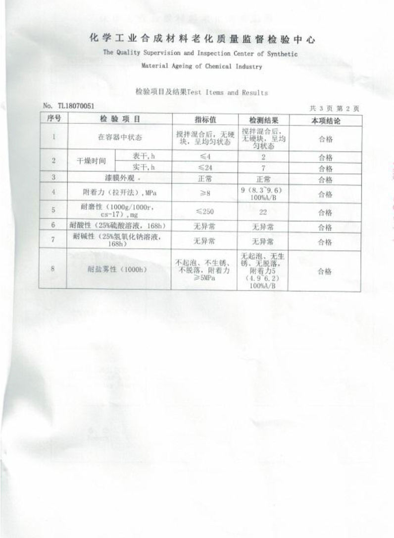 1) 附著力強 具有極強的附著力,耐沖擊性好(100cm):無裂紋,涂膜不脫落 螺旋劃痕試驗漆膜無變化,耐彎曲性能優(yōu)良:漆膜無開裂和剝落。